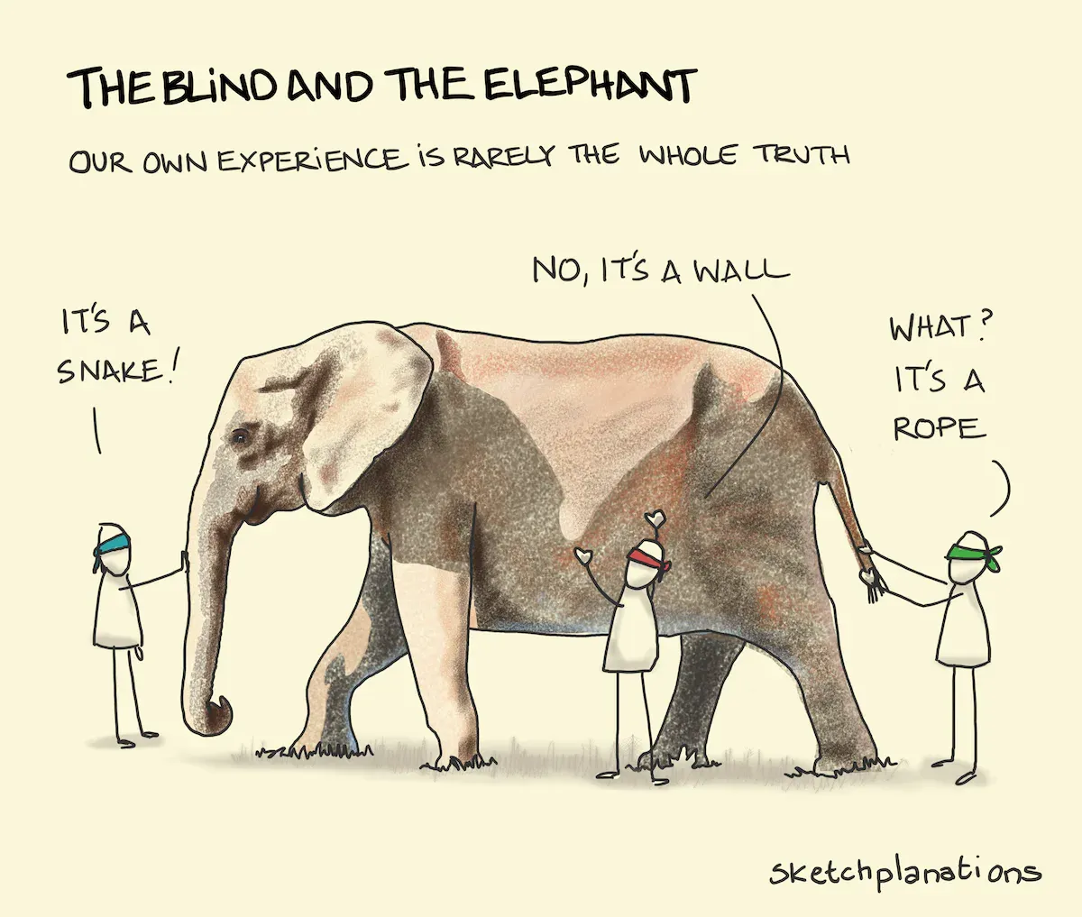 Moreover, when creating something new, we often encounter restraining forces. As humans, we frequently feel discomfort when our worldview is challenged, often being convinced of our own 'rightness.' However, is our human perception truly aware of all factors and situations that can paint the complete picture? Consider the analogy of blind people touching an elephant, each believing they comprehend the entire truth. They're unaware of what they don’t know, yet they claim their truth as the universal truth.